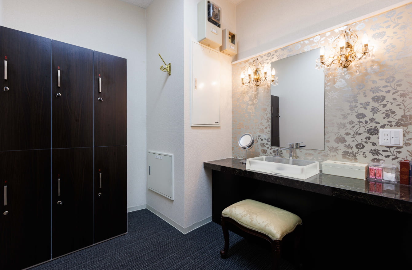 レッスン後にメイク直しなどしやすいよう大きな鏡、コットンなどの備品も完備。貴重品などを収納できるロッカーもご利用いただけます。